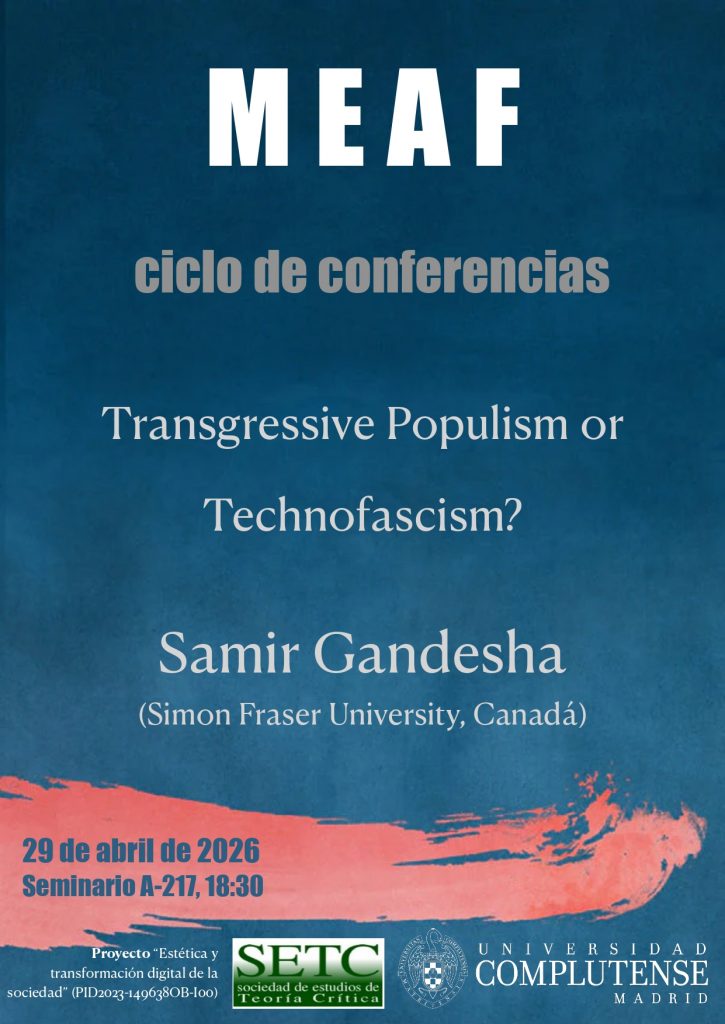 Conferencia invitada de Samir Gandesha (Simon Fraser University), «Transgressive Populism or Technofascism«. La conferencia, organizada en colaboración entre la SETC, el Máster en Estudios Avanzados en Filosofía de la UCM y el proyecto «Estética y transformación digital de la sociedad» (PID2023-149638OB-I00), se celebrará el miércoles 29 de abril a las 18:30 en el Seminario 217 de la Facultad de Filosofía de la Universidad Complutense de Madrid (Edificio A).
